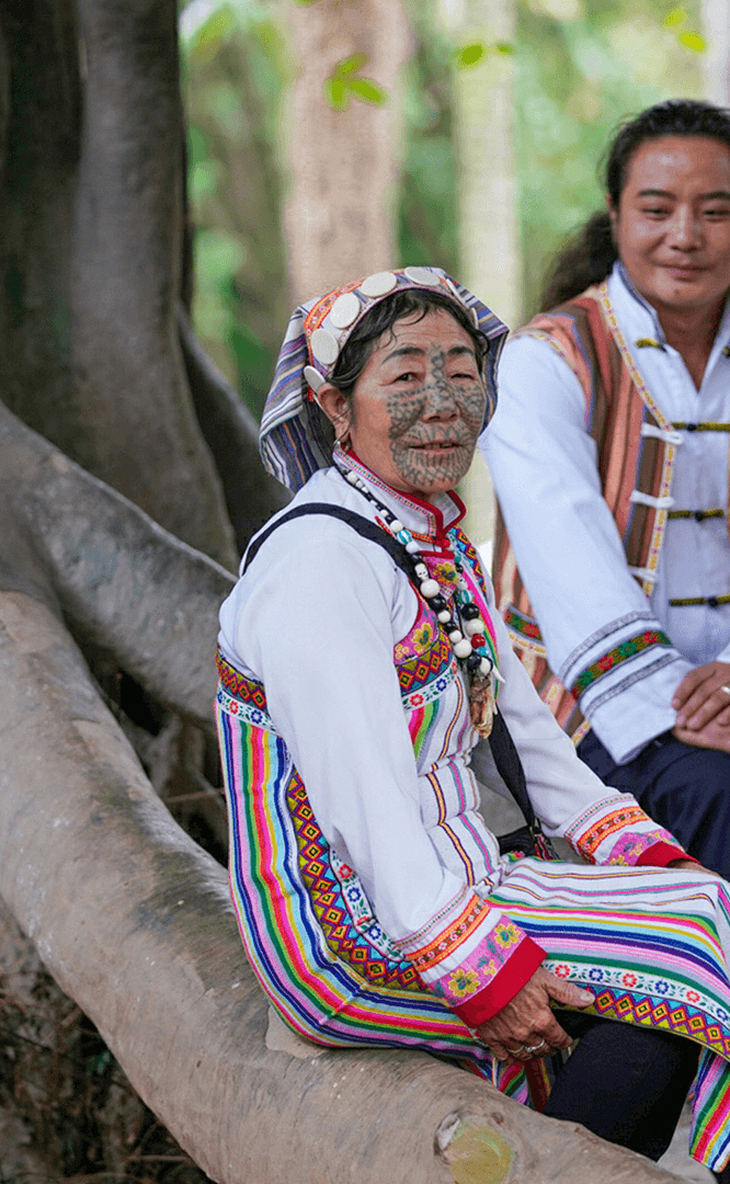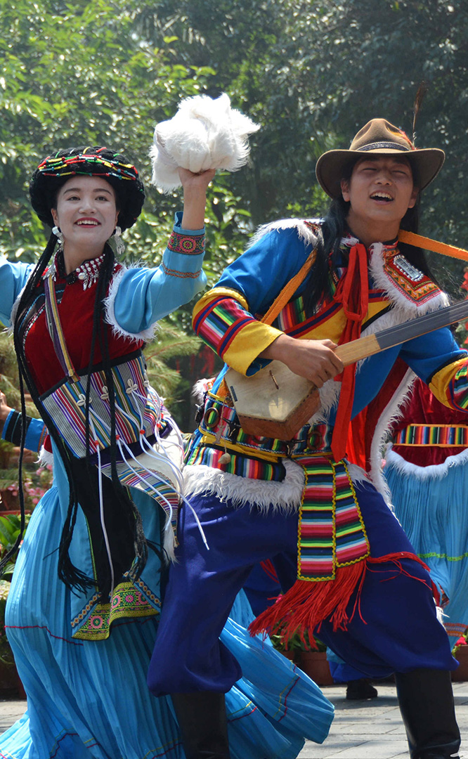 彝族在云南境內(nèi)約471萬(wàn)人,是省內(nèi)人口最多、分布最廣的少數(shù)民族,主要聚居在金沙江、元江流域和哀牢山、無(wú)量山腹地。彝族是一個(gè)能歌善舞的民族,民間打歌、跳樂之風(fēng)盛行,大三弦、跌腳舞久負(fù)盛名。火把節(jié)是彝族最具特色的民族節(jié)日。彝族村占地50余畝,三虎浮雕墻與虎頭內(nèi)祖師形象表現(xiàn)了彝族虎鷹文化。太陽(yáng)歷廣場(chǎng)圖騰柱上有太陽(yáng)、虎、火和八卦圖形象,周圍環(huán)繞著10個(gè)朝向不同的月球造型,外圓周有12生肖石雕。依山而建的“...